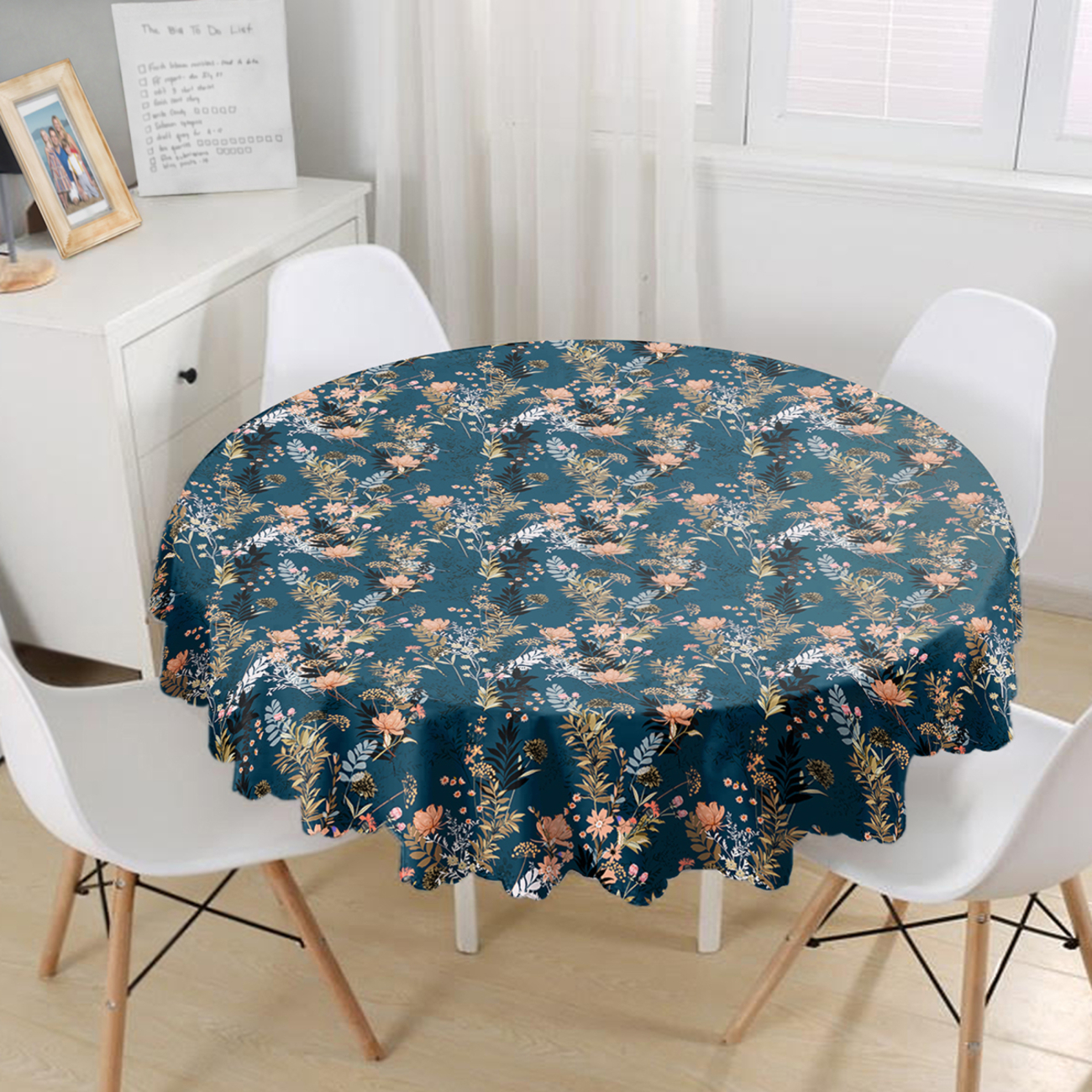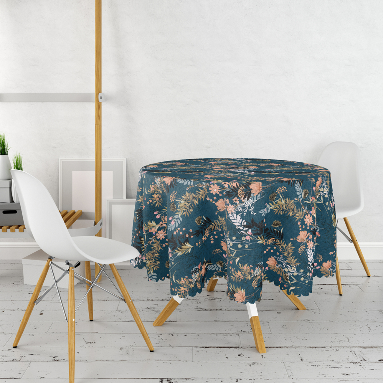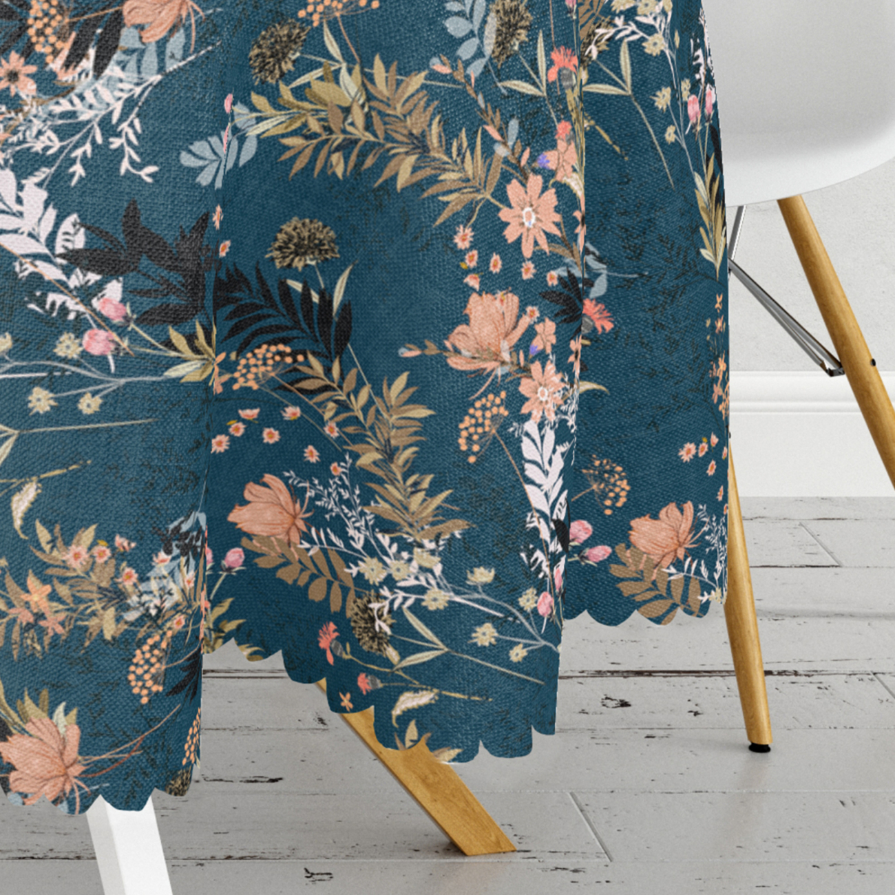 Rond Tafelkleed Ø140cm – Bloemen op donkerblauw – Bedrukt Velvet Textiel